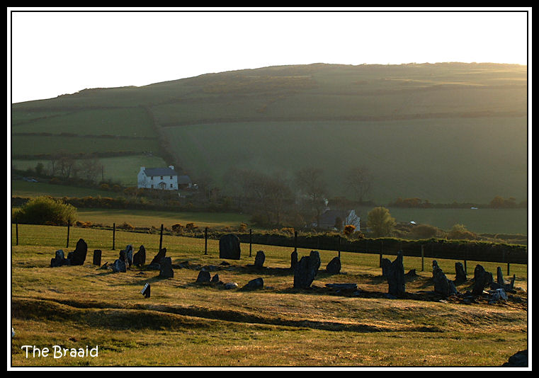 Looking into the setting sun over the Celtic roundhouse