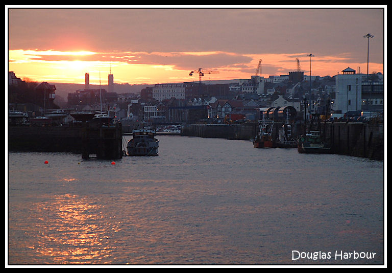 An evening view over the harbour into the setting sun