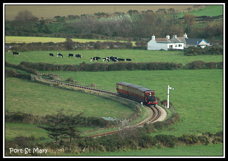 A Steam Railway train rounds the curve approaching Port St Mary station