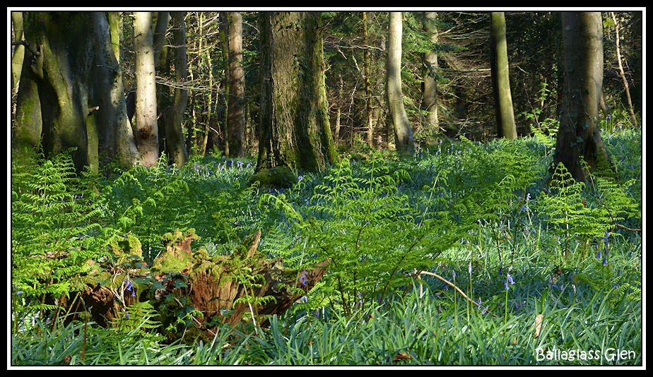 In the woodland there is just a scattering of bluebells in flower