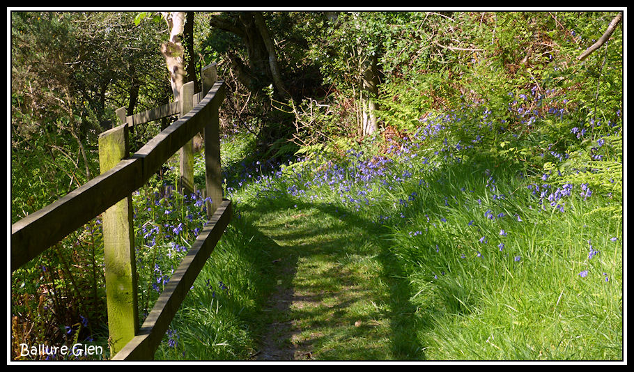 Bluebells lining a path in Ballure Glen