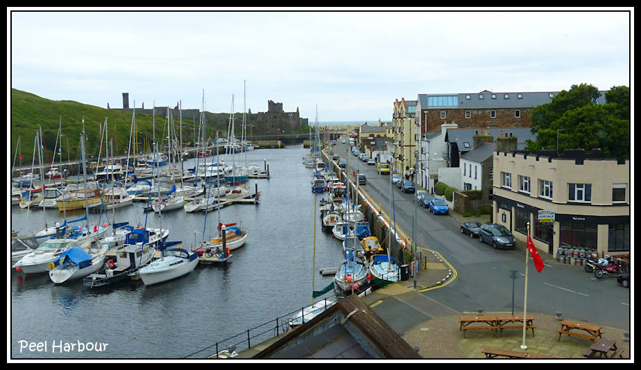 View over Peel harbour to the castle from the House of Manannan
