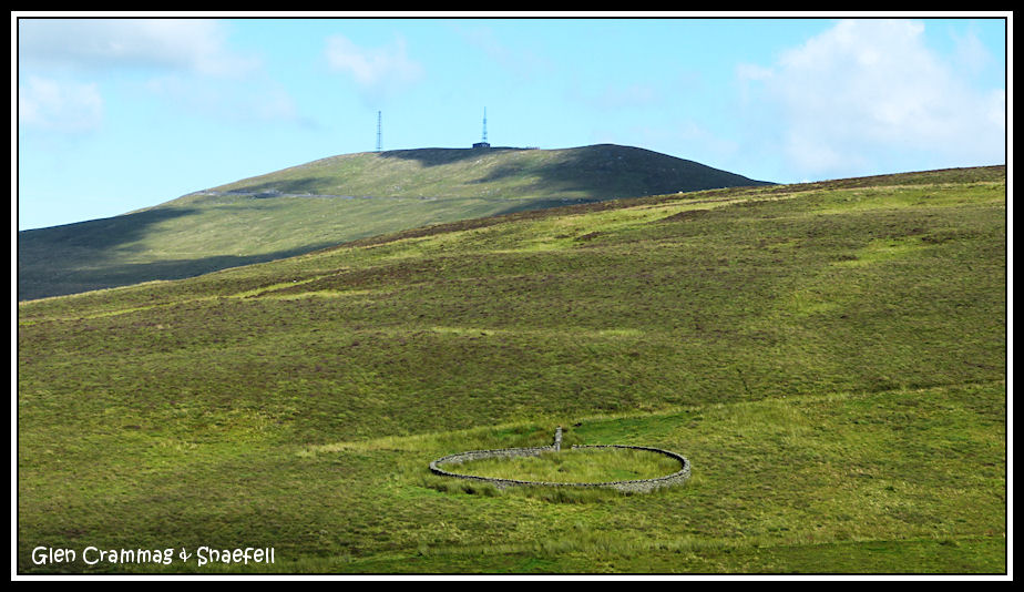 A circular sheepfold on the side of Glen Crammag, with Snaefell summit beyond
