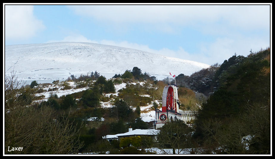 The Laxey Wheel with a snow covered hillside behind