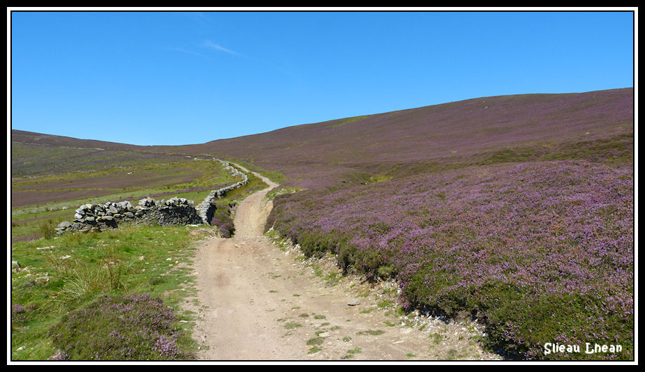 Looking back along the track, with a heather covered Slieau Lhean to the right