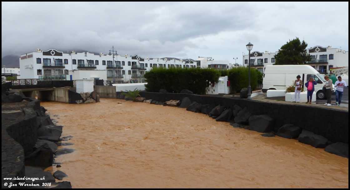 Flood waters run away into the Rubicon Marina after heavy rain drenched the island overnight and for much of the day