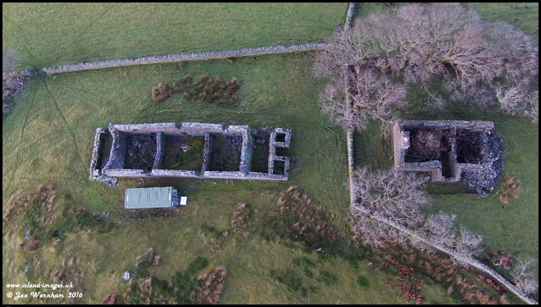 A near vertical view of The Creggans. Remains of old farm machinery are still in the big barn ans scattered around outside. The damage to the end wall of the farmhouse can be seen clearly.