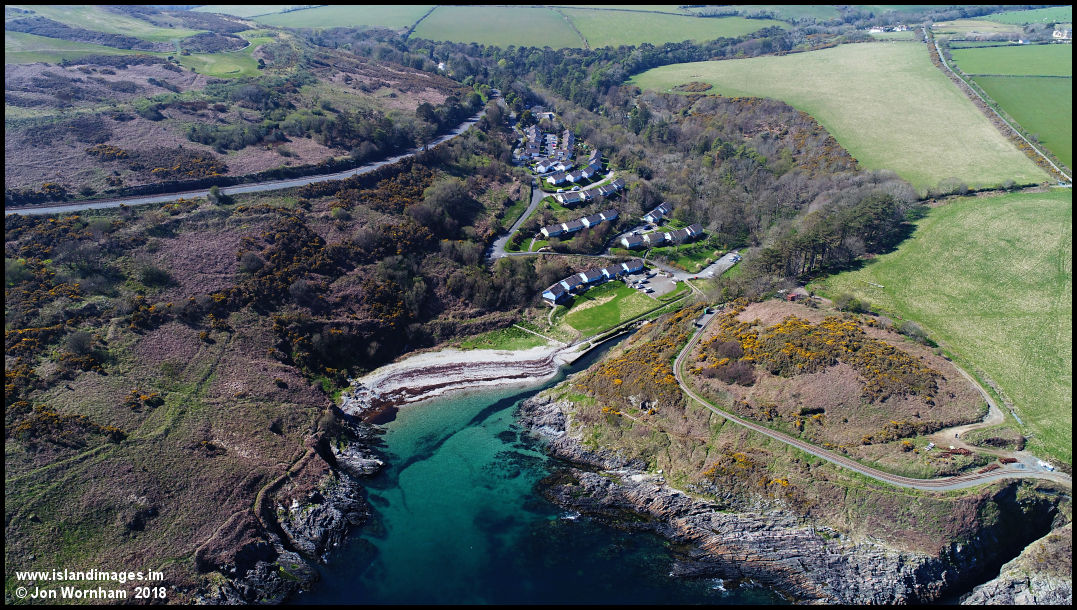 Looking down to the Groudle holiday cottages and clear waters in the bay.