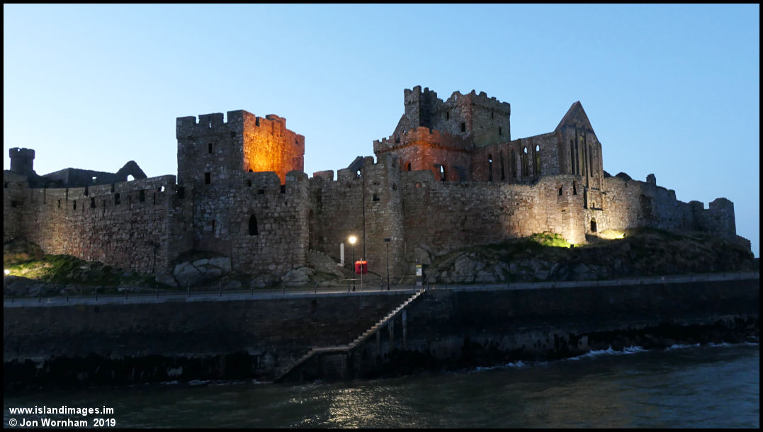 Peel Castle illuminated at dusk.