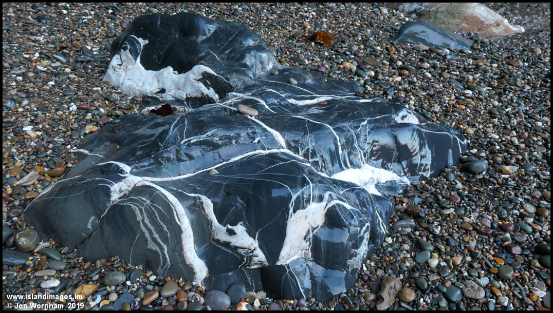 A sea eroded rock with embedded quartz veins by the entrance to the caves.