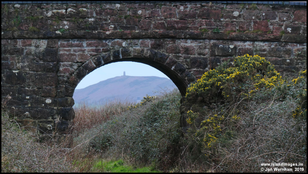 Corrin's Tower on Peel Hill, framed by the Manx Northern Railway bridge at Lhiannag.