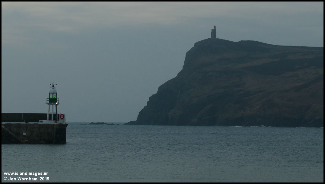 Port Erin breakwater lighthouse and Bradda Head at dusk.