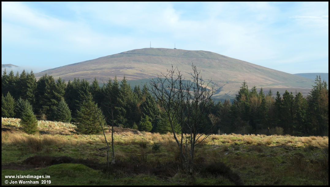 In the higher part of Tholt-y-Will Planatation, with a good view across a clearing to Snaefell.