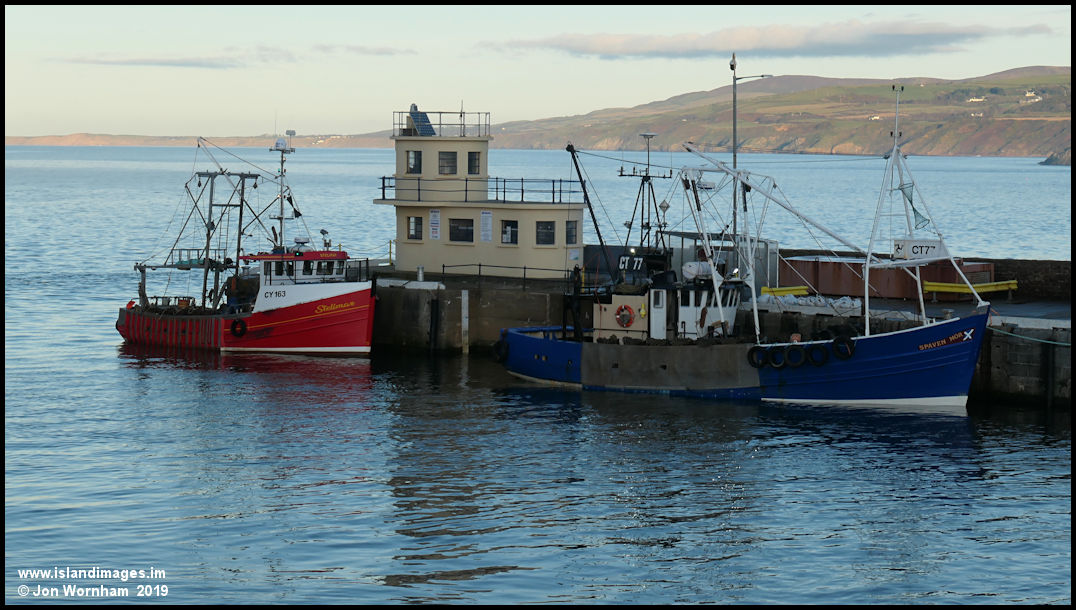 Fishing boats in the outer harbour. Local vessel 'Spaven Mor' is on the fuel beth with the 'Stelimar' from Castlebay on the Scottish island of Barra moored astern.