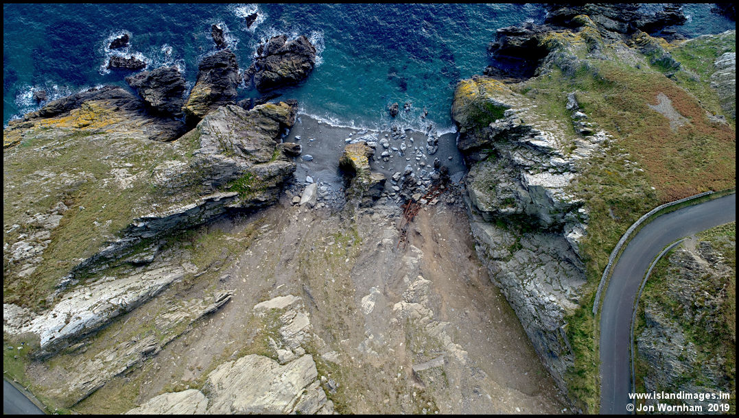 Descending lower, looking straight down on the natural rock arch here, with the remains of the DSET viaduct still visble on the cliffs where it fell.