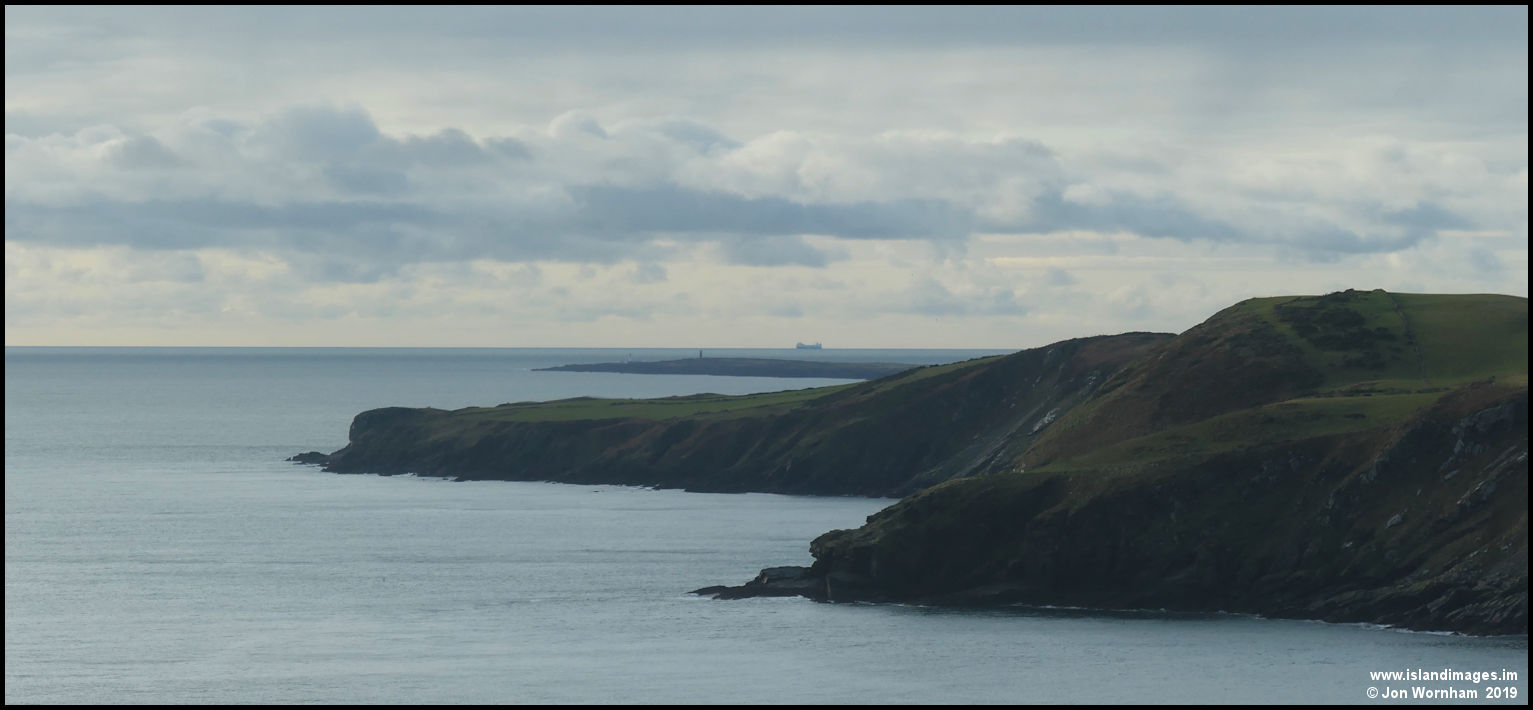 View looking south from the Marine Drive, across Port Soderick bay to Santon Head, with Langness and a passing ship in the distance.