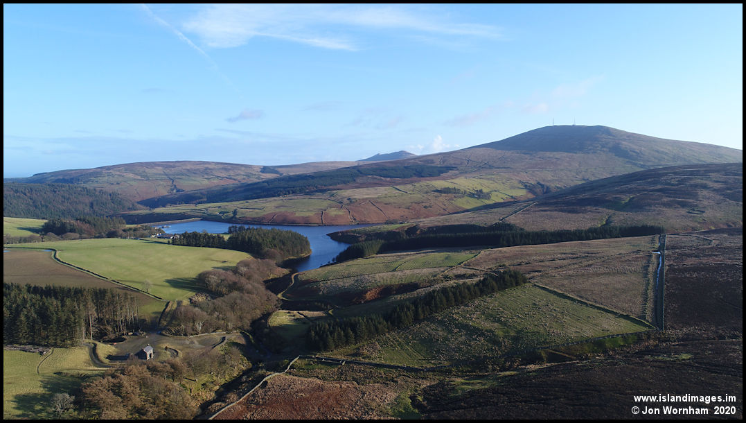 Turning the camera to the east to take in the views over Sulby Reservoir to Snaefell.