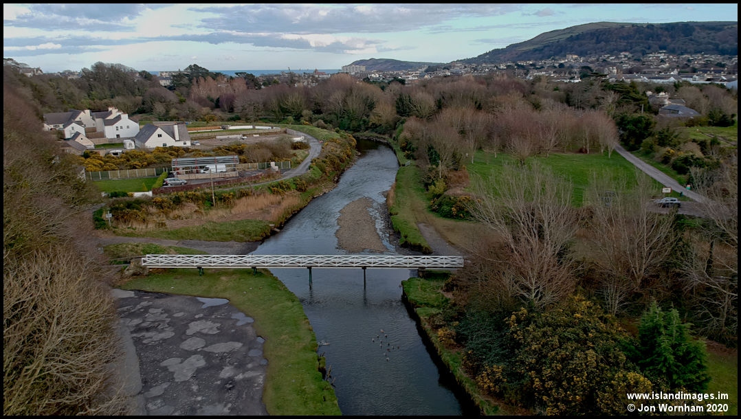A lower level vie of the White Bridge across the Sulby River.