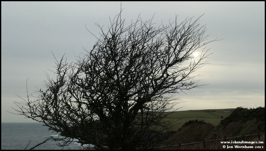 A very hazy sun attempts to break through the clouds behing this windswept bush on the