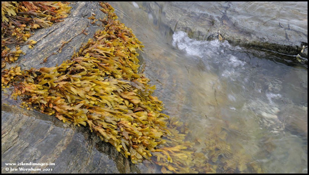Water swirls around the rocks and seaweed.