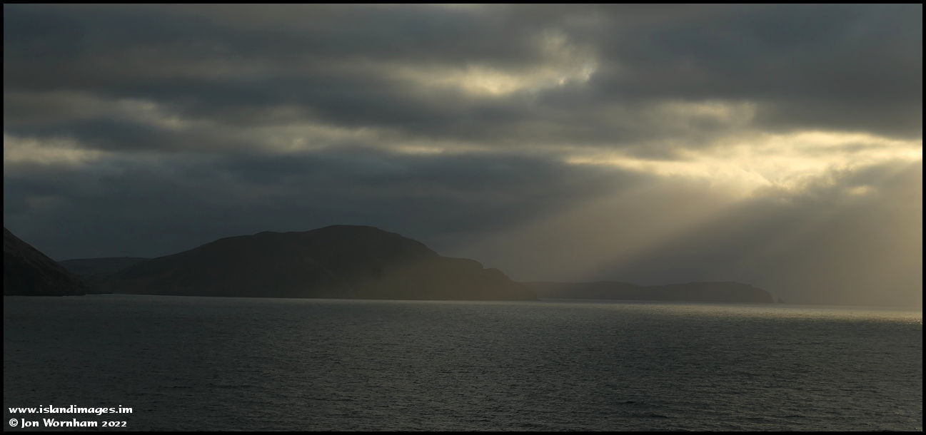 A ray of sunlight over the sea with Bradda as a dark backdrop.