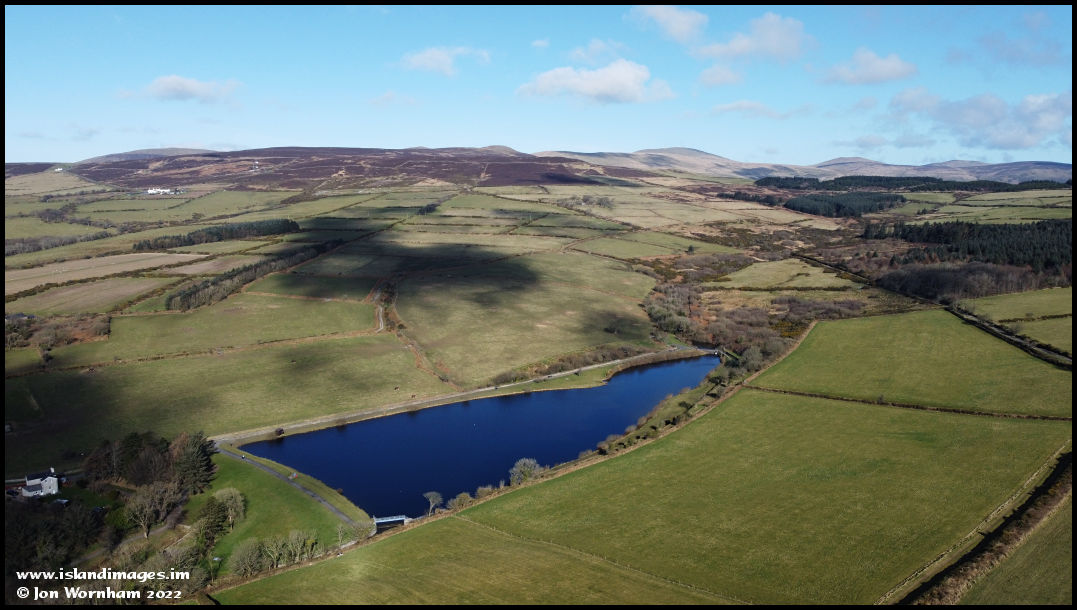 The Clypse Reservoir, constructed by the Douglas Waterworks Company between 1875 and 1878. The Creg-ny-Baa pub and Kate's Cottage can be seen to the far upper left of the picture.