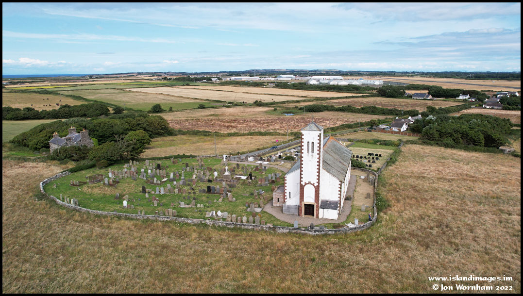 Climbing higher and moving around to the west in this view. The churchyard is divided into several sections, with the nearest almost circular one being the oldest. Jurby Airfield in the background.