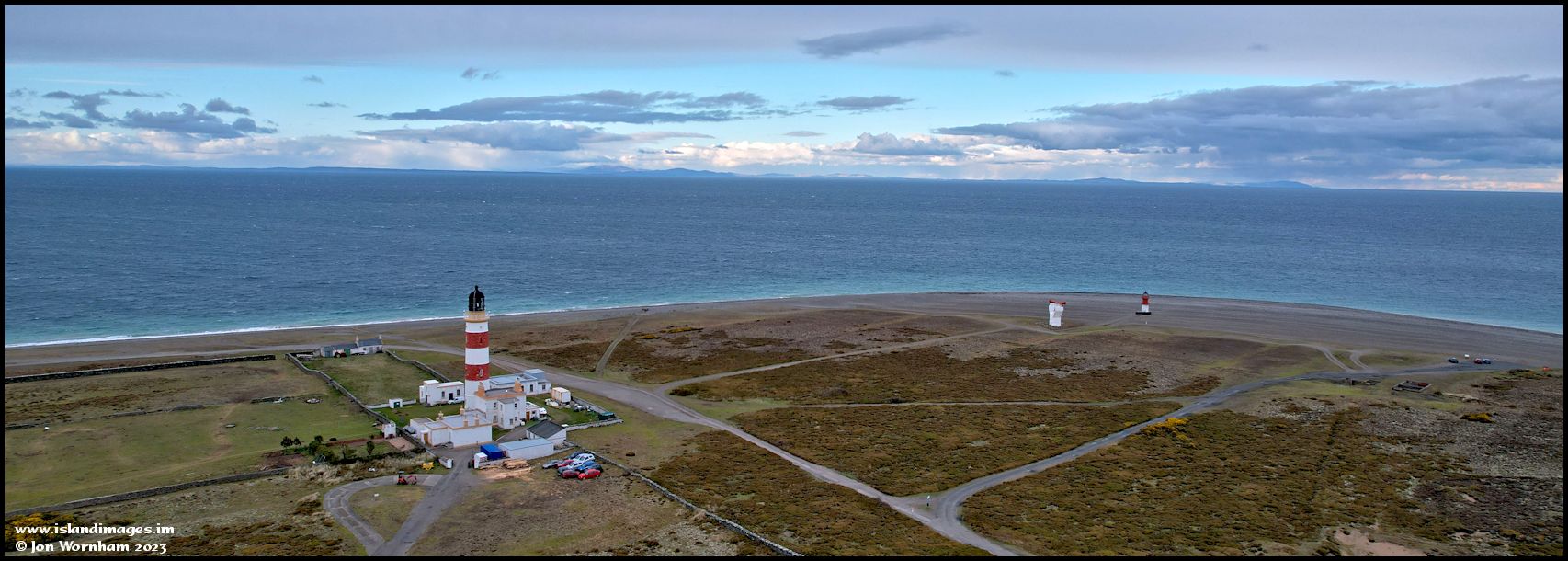 Lighthouses and foghorn at the Point of Ayre, with the southern Scottish mountains on the horizon.