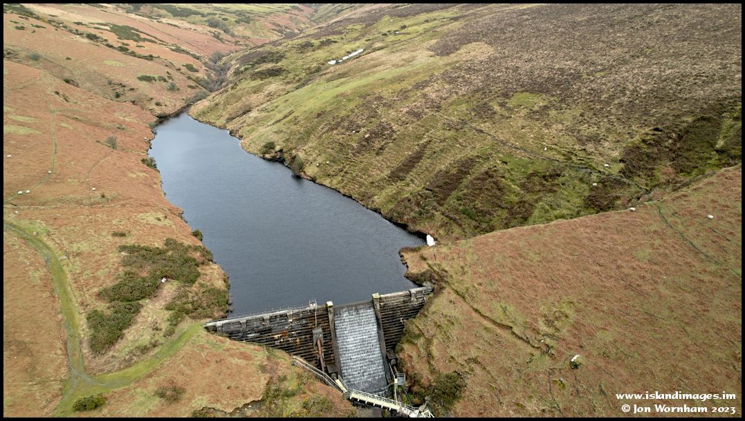 A closer view of Block Eary Reservoir. Despite the hydroelectric station seeming to be running at full power, the reservoir if full with excess water spilling across the 'overflow' section of the dam.
