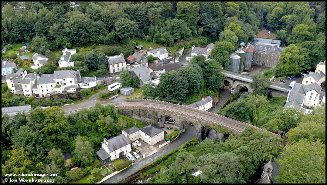 Turning the camera to the right for this picture of the Electric Railway and the road crossing the lower end of Glen Roy on high viaducts, with the Laxey Flour Mill nestling in the trees behind.
