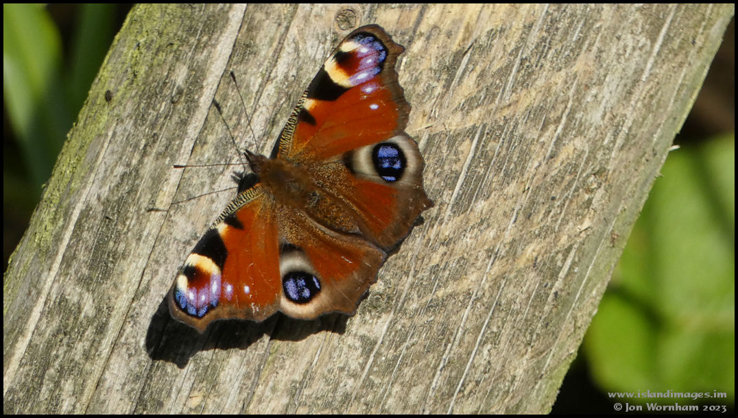 Much easier to photograph was this Peacock butterfly sunning itself on a piece of wood.