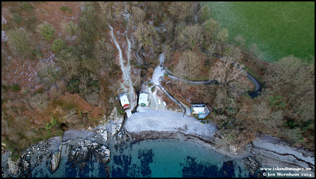 A vertical view of Garwick Beach, with the three means of access visible. From left to right - the footpath up to the Clay Head Road, the glen path, then the narrow twisting road up to the main Laxey road.
