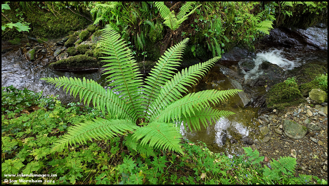 A slightly unusual view, looking vertically down on a fern growing on the stream bank.