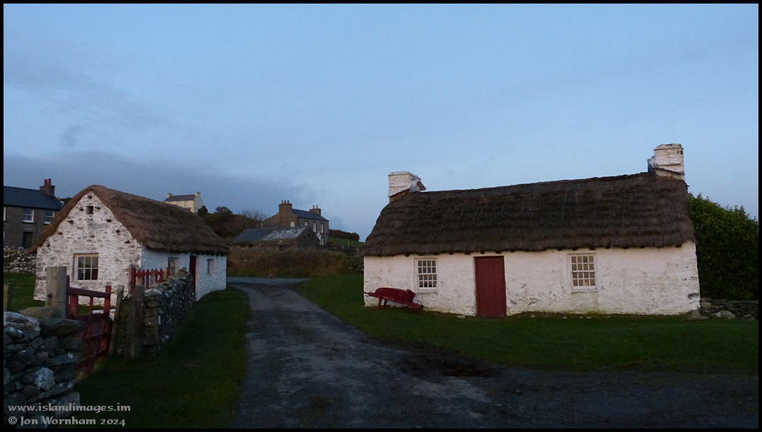 The late afternoon sun illuminates traditional Manx thatched cottages at Cregneash on the 1st of January 2013