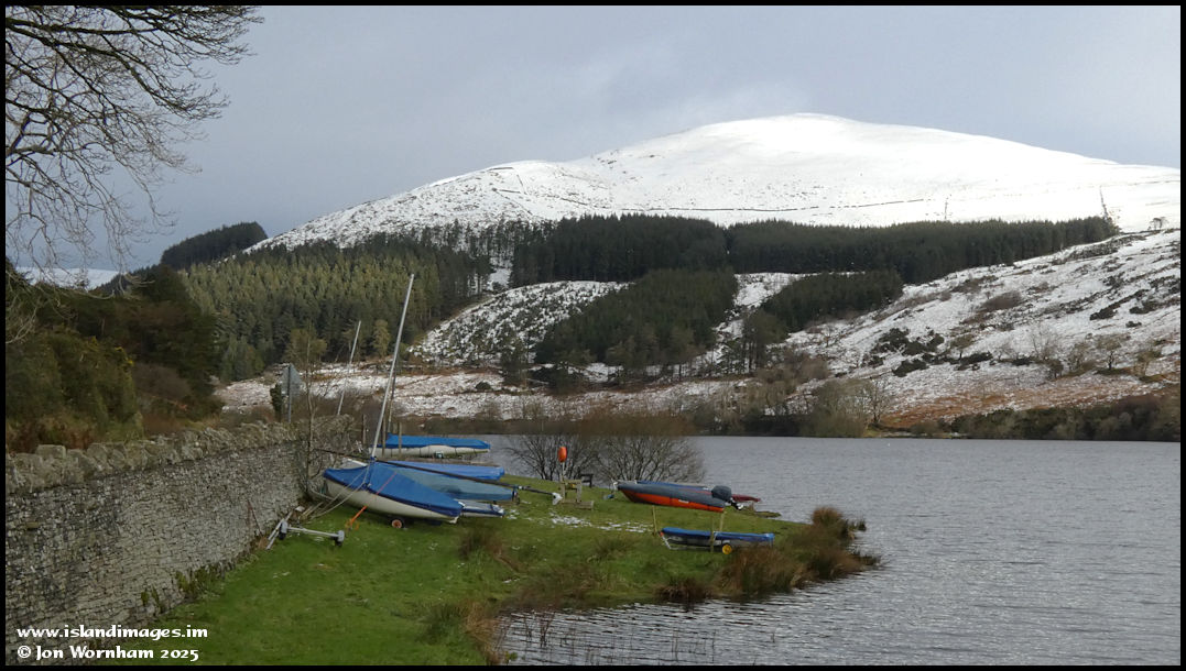 Sailing boats on the shore of Injebreck Reservoir, with a snow covered Carraghan behind.