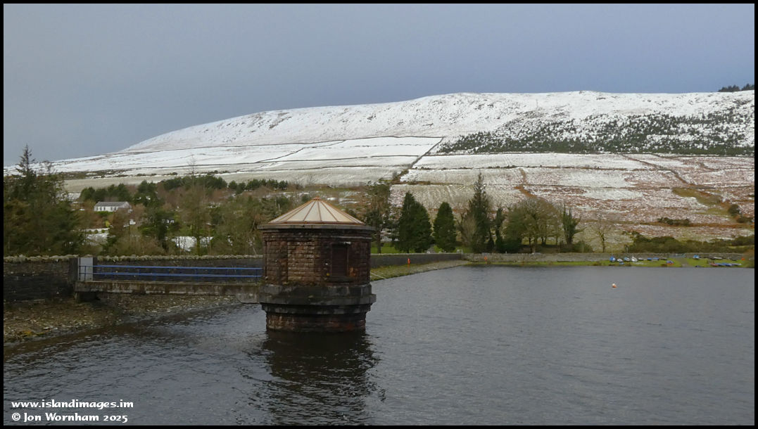 From the far side of Injebreck Reservoir, looking back along the dam, with 'The Creg' rising beyond.