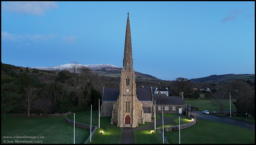After around a fifteen minute wait in the car, the ambient light levels had dropped sufficiently to show up the floodlighting on the church and Tynwald Hill, so I'm airborne for the second flight.