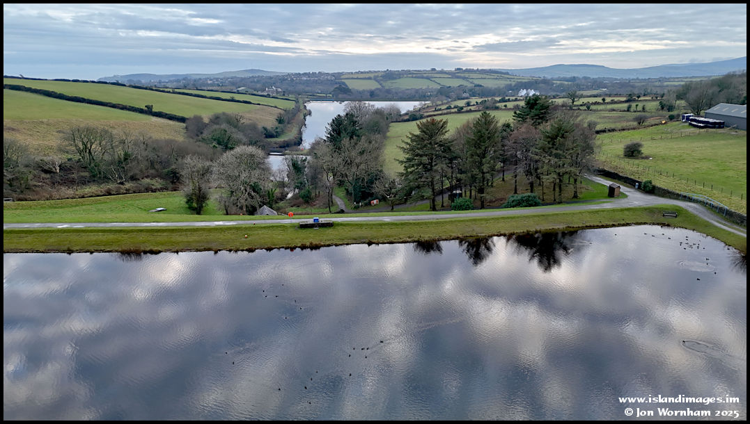 Looking south over The Clypse Reservoir dam, showing the different levels of the two reservoirs (its around 60 ft). The birds on the water are a mixture of Mallard Ducks, Coots and Moorhens.