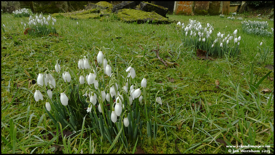Patches of snowdrops in the graveyard.