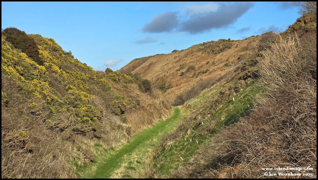 Looking north from the railway bridge, but whoever thought it would be a good idea to build a railway line along the face of unstable cliffs? You can see that the now footpath drops away dramatically just ahead!