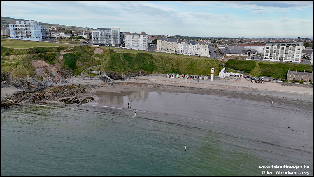The beach lighthouse at Port Erin, with the colourful beach huts alongside.