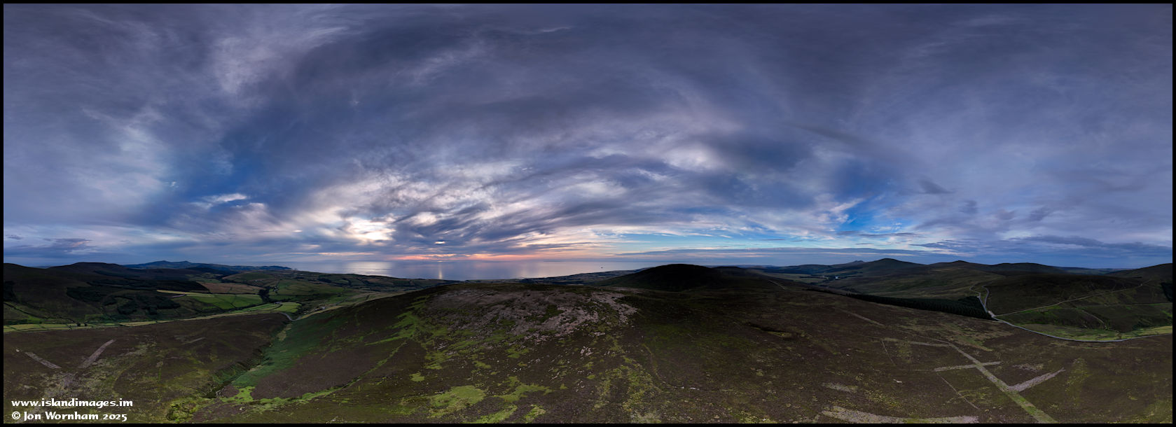 360 degree sunset sky panorama at Sartfell.  As the scene pans around you can see the Mull of Galloway in the distance and the Steam Packet's 'Manxman' heading south on a round the island cruise.
