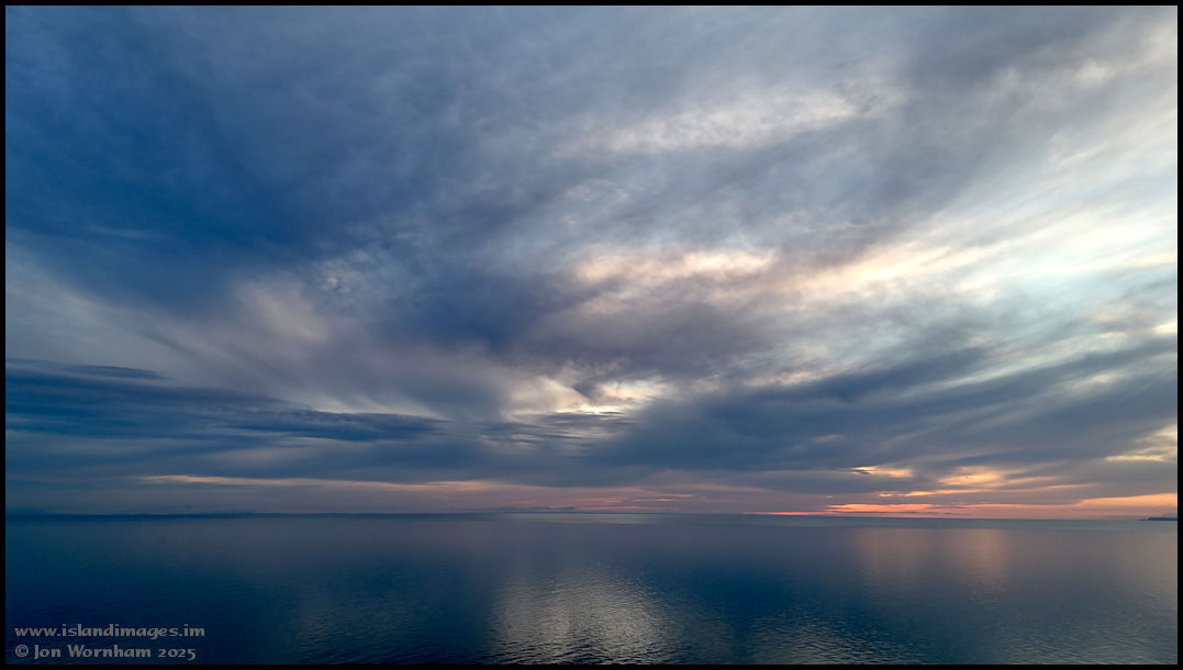 Turning the camera out to sea, there are some nice colours but doesn't look we're going to actually see the sun set. In the centre of the picture, the Mountains of Mourne are partially obscured by clouds below summit level.