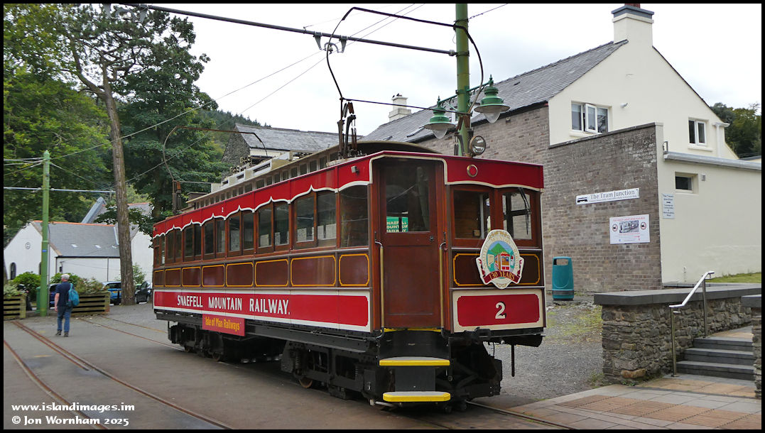 Snaefell Mountain Railway Car No 2 awaits its next trip to the summit. This year is the 130th anniversary of the Mountain Railway and the cars are carrying special headboards.