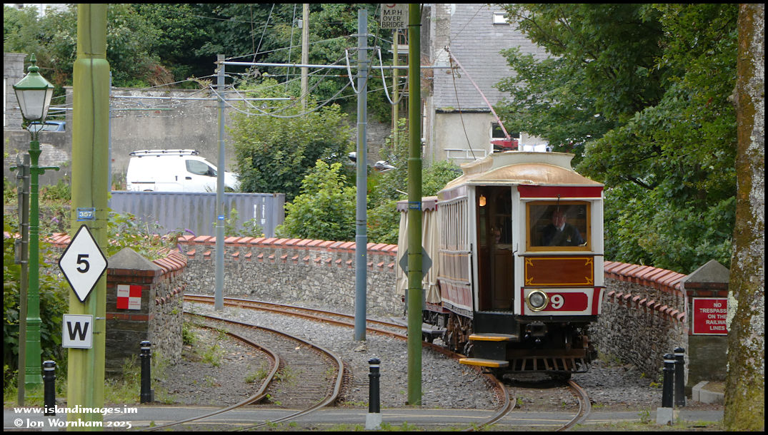 Car No 9 about the enter the station from the viaduct.