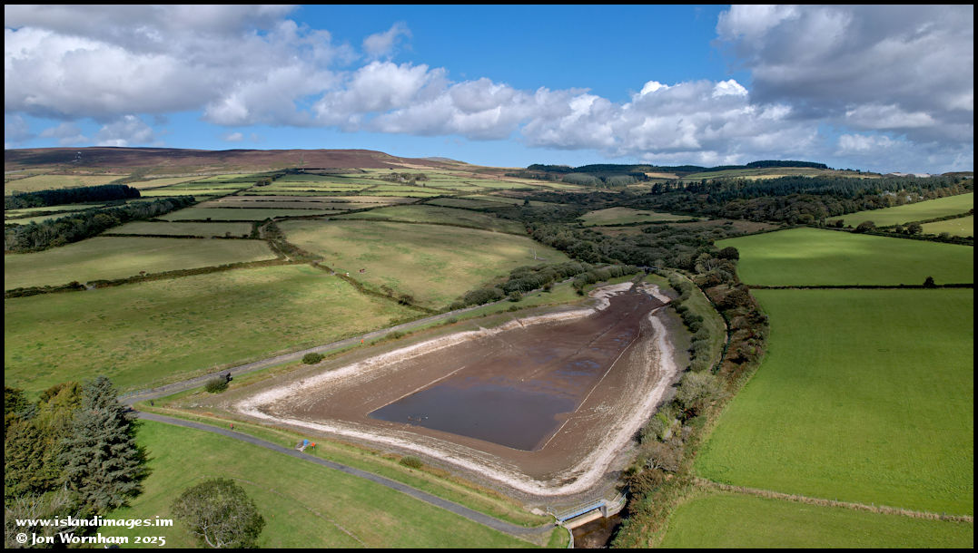 Looking north across The Clypse reservoir, now almost completely drained. The Groudle River supplies both of the reservoirs here, but each has a diversion channel, seen here on the right.
