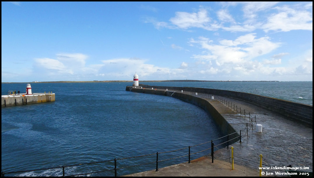 Harbour breakwaters with evidence of some splash-over from the high tide.