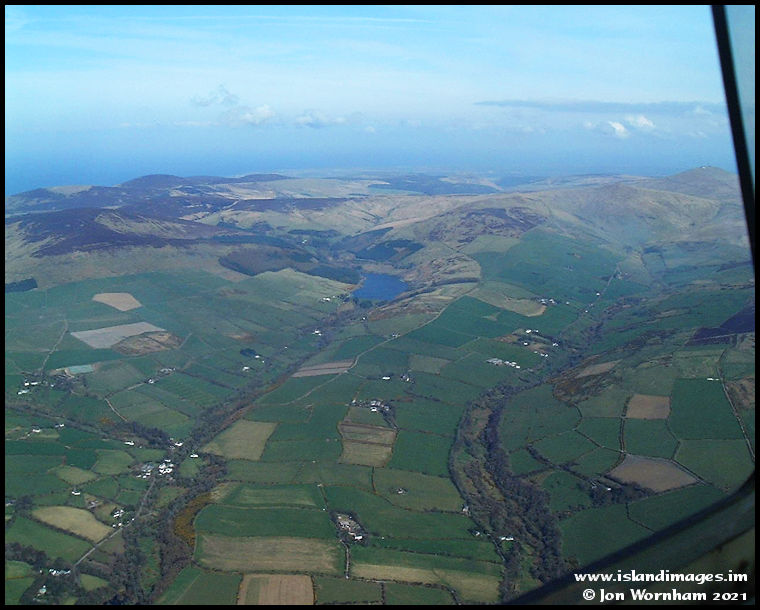 The west and east Baldwin Valleys with Injebreck Reservoir. Snaefell in the distance at the upper right of the picture.