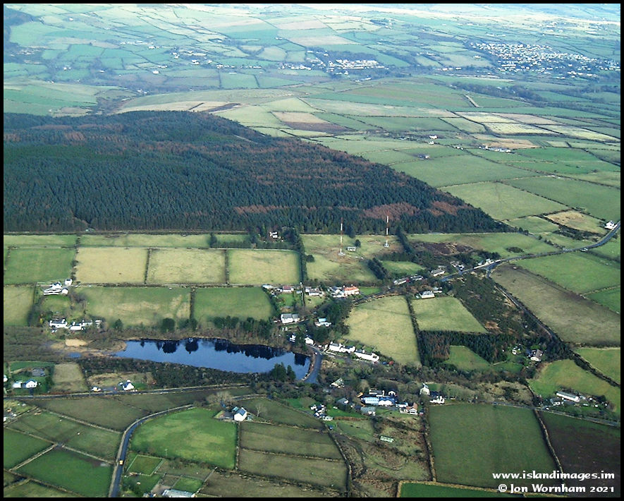 Another reservoir, this is at The Eairy and I think it was used to power a saw mill further down the valley, although there was also a mine here. Manx Radio's medium wave transmitter masts can be seen near the plantation.