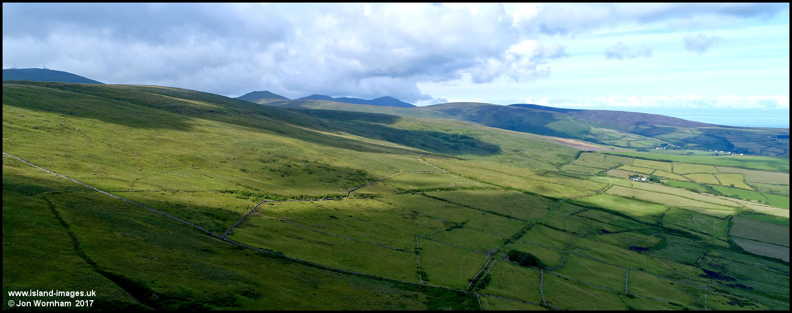 This view over farm and moorland is from near Windy Corner, looking to Snaefell and